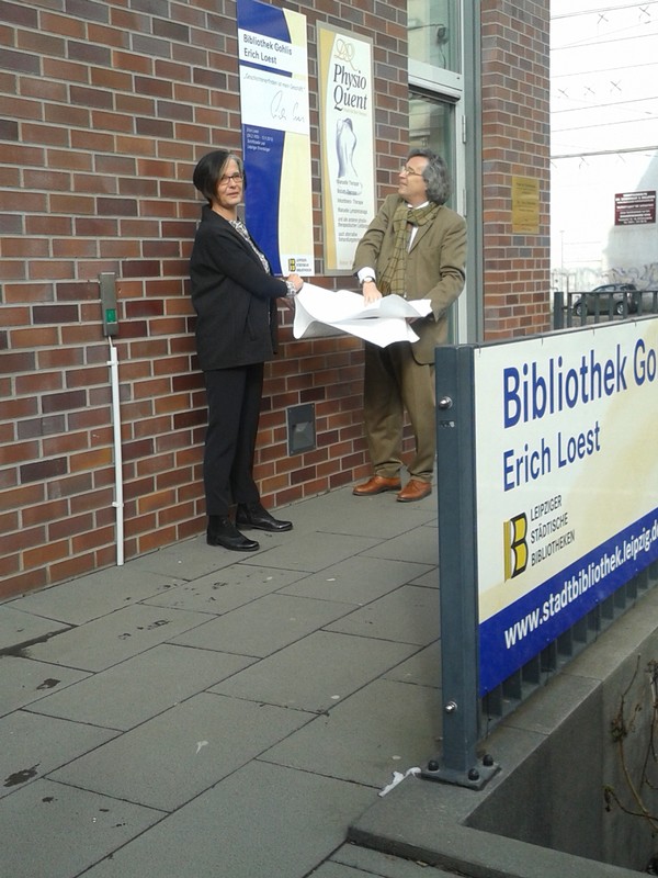 Die Namensweihe wurde mit der Enthüllung des Schildes am Eingang der Bibliothek im Gohliser Stadteilzentrum durch den Kulturbürgermeister Michael Faber sowie die Leiterin der Städtischen Bibliotheken, Frau Susanne Metz eröffnet. Anschließend fand in den Räumen der Stadtteilbibliothek eine kleine Feier statt. Michael Faber würdigte in einer Ansprache die Bedeutung Erich Loests für die Stadt und die Bibliotheken hier in Leipzig.