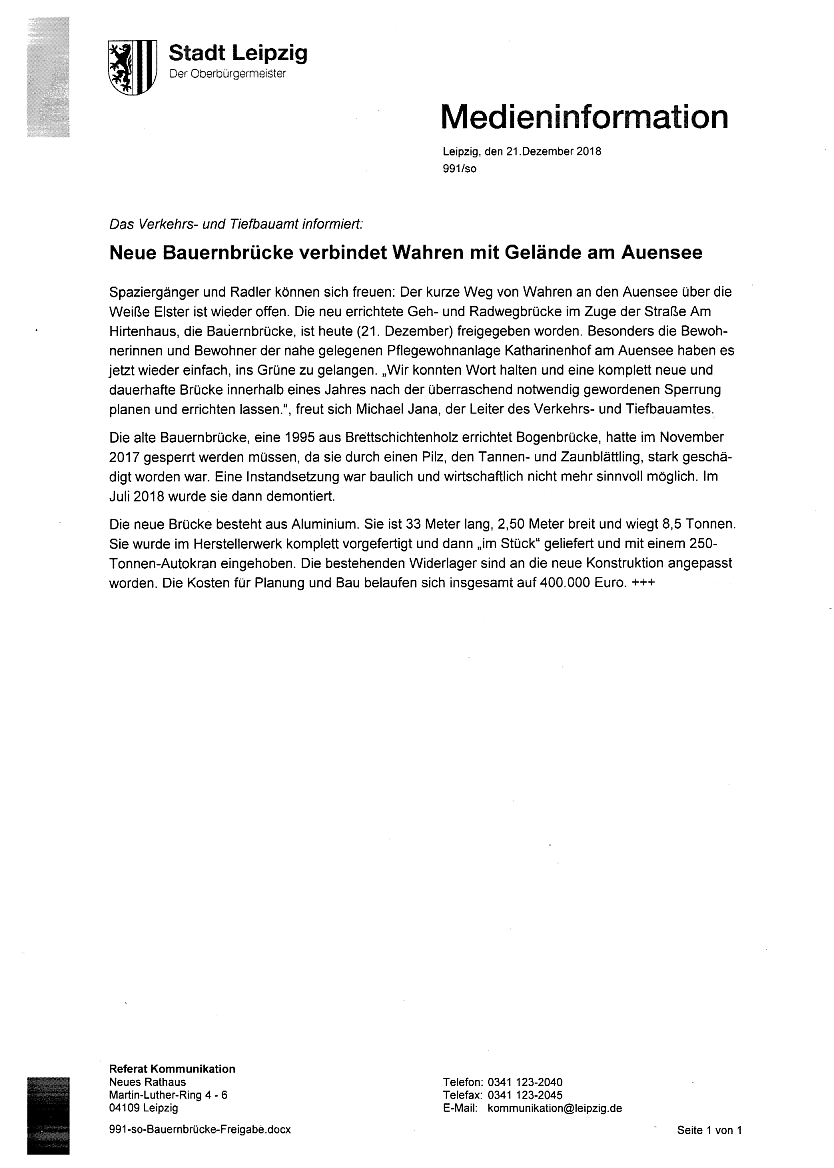 Endlich ist es soweit, die seit einem Jahr gesperrte Bauernbrücke wurde am 21. Dezember um 13:00 Uhr durch den Amtsleiter des Verkehrs- und Tiefbauamtes, Herrn Jana, für den Verkehr freigegeben. Bis vor Kurzem sah es noch nicht so aus, als ob den Bürgerinnen und Bürgern unseres Wohngebietes dies noch als quasi Weihnachtsgeschenk zuteil werden würde. Die Initiative des Bürgervereins und die zahlreichen Unterschriften haben sich letztendlich gelohnt. Bewirkten sie doch, dass diese wichtige Verkehrsverbindung für Erholungssuchende bereits 2018 wiederhergestellt wird.