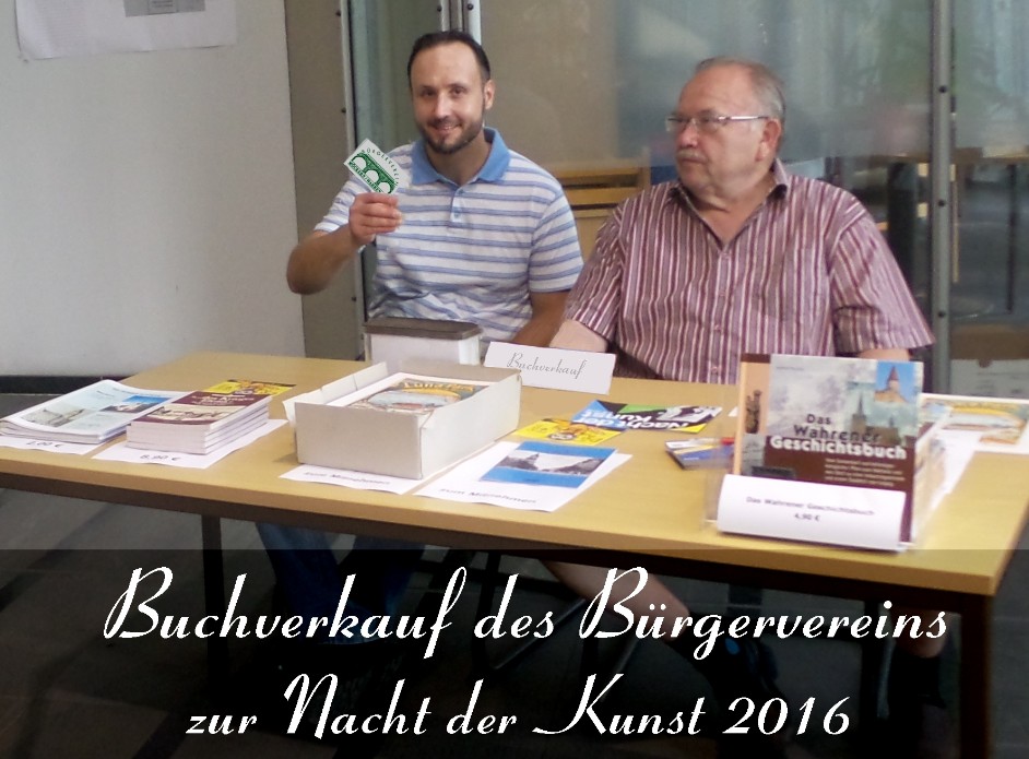 Der Bürgerverein Möckern-Wahren e. V. führte am 03.09.2016 im Rahmen der Veranstaltung „Nacht der Kunst“ von 15.00 Uhr bis 22.00 Uhr einen Büchermarkt im Foyer des Glashausen Georg-Schumann-Str. 294 durch. Angeboten wurden unter anderem unsere vereinseigenen Bücherveröffentlichungen. Besonders das "Wahrener Geschichtsbuch", "Die Straßen in Leipzig -