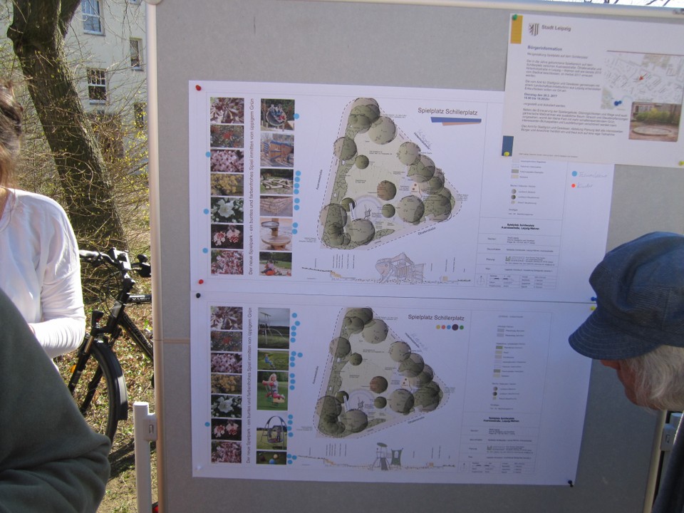 Am Dienstag, dem 28.03.2017, in der Zeit von 16.00 Uhr – 18.00 Uhr, stellten Frau Sabine Christiansen und Herr Torsten Zech, beide vom Amt für Stadtgrün und Gewässer, die Entwurfsideen zur Sanierung des Schillerplatzes vor Ort vor.